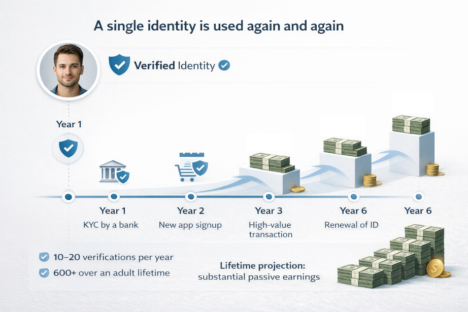 What drives your income: Number of people verified / Frequency of authorized reuse / Your locked-in earnings rate.