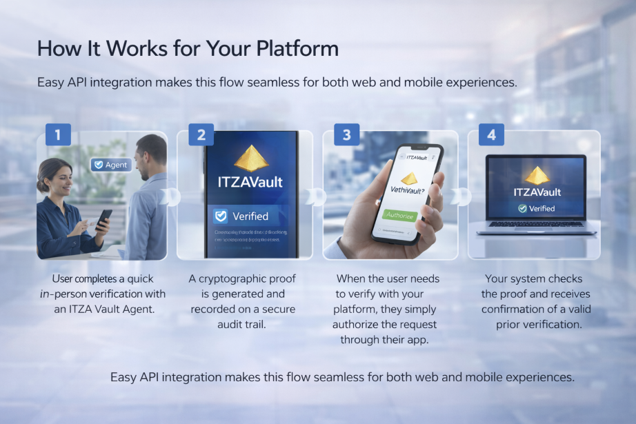 Powered by a cooperative network of vetted human Agents - notaries and legal professionals - ITZA Vault combines trusted in-person verification with reusable cryptographic proof. Businesses get higher accuracy, significantly lower user friction, reduced data duplication, and a trust layer that customers can actually feel good about.