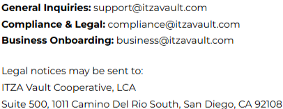 Questions regarding platform use, business onboarding, refunds, status changes, or compliance may be directed to the ITZA Vault team.