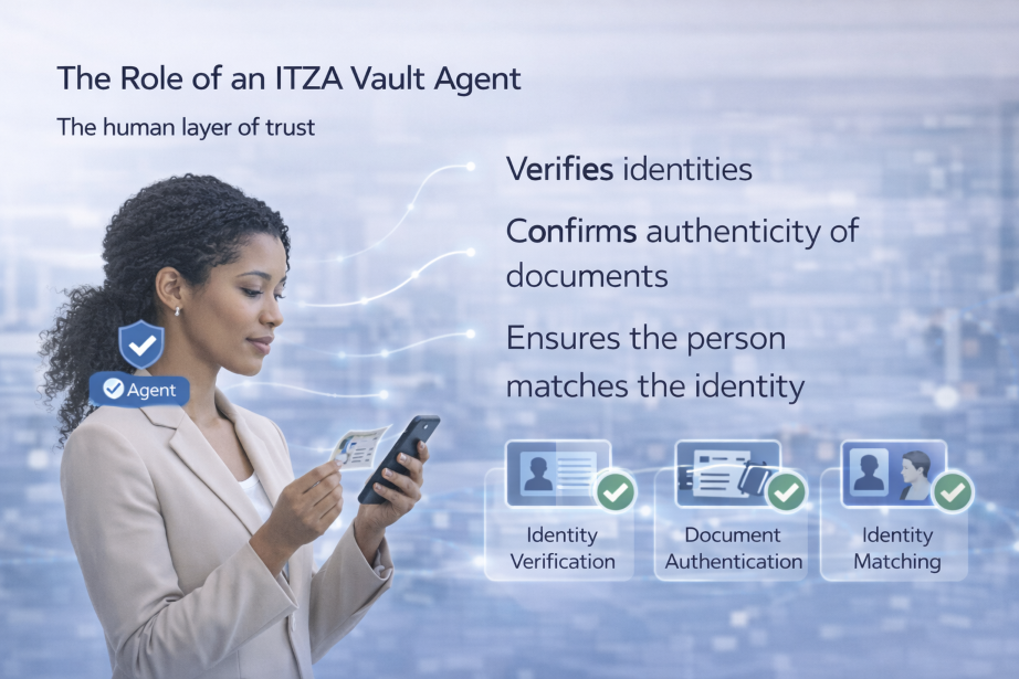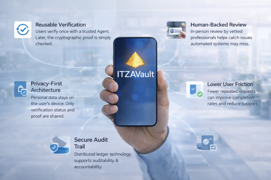 Powered by a cooperative network of vetted human Agents - notaries and legal professionals - ITZA Vault combines trusted in-person verification with reusable cryptographic proof. Businesses get higher accuracy, significantly lower user friction, reduced data duplication, and a trust layer that customers can actually feel good about.