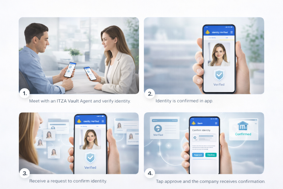 Instead of asking you to submit your documents over and over to different companies, ITZA Vault lets you establish trusted identity verification through the ITZA Vault app and then reuse that verification later when needed.